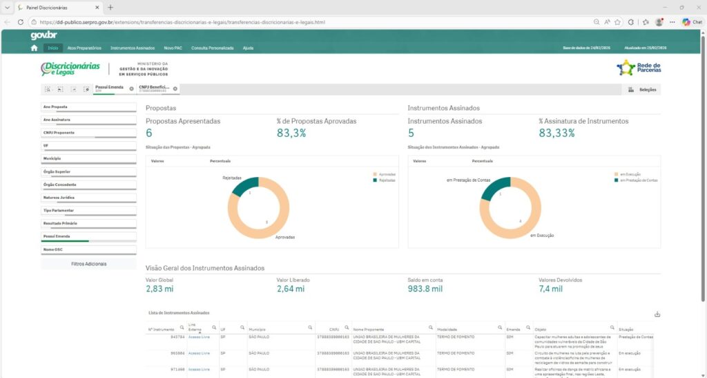 Os dados apresentados demonstram a efetividade na captação e execução de recursos por meio de transferências discricionárias destinadas à União Brasileira de Mulheres da cidade de São Paulo. Foram cadastradas seis propostas, das quais cinco foram aprovadas, resultando em um índice de aprovação de 83,3%. Esse desempenho se reflete também na formalização dos instrumentos, com cinco termos de fomento assinados e em diferentes estágios de execução e prestação de contas.